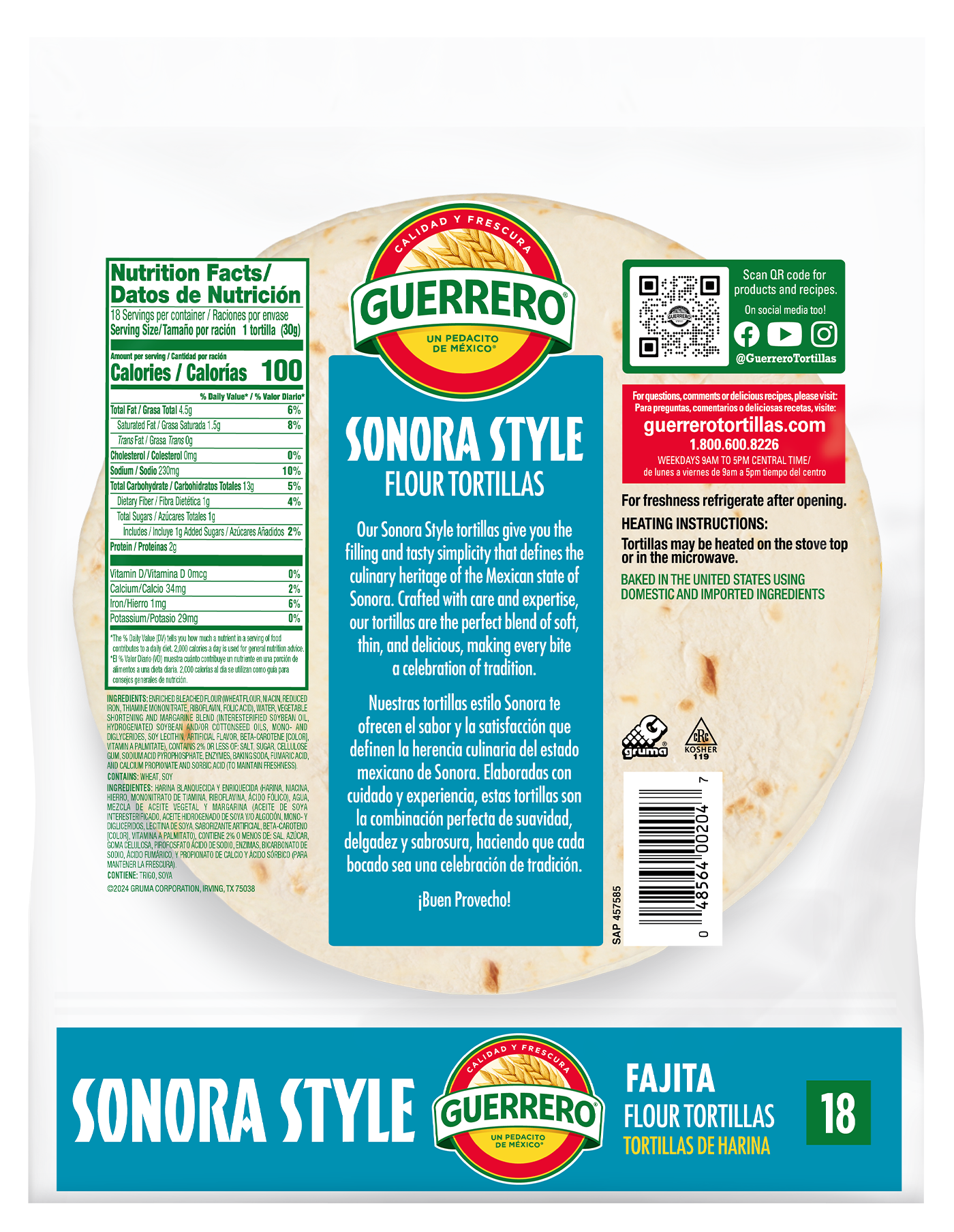 Ingredients: harina blanquecida y enriquecida (harina, niacina, hierro, mononitrato de tiamina, riboflavina, ácido fólico) agua, mezcla de aceite vegetal y margarina (aceite de soya interesterficado, acetite hidrogenado de soya y/o algodón, mono- y digliceridos, lecitina de soya, saborizante artificial, beta-caroteno [color], vitamina a palmitato, contiene 2% o menos de: sal, azúcar, goma celulosa, pirofosfato ácido fumárico, y propionato de calcio y ácido sórbico (para mantener la frescura).