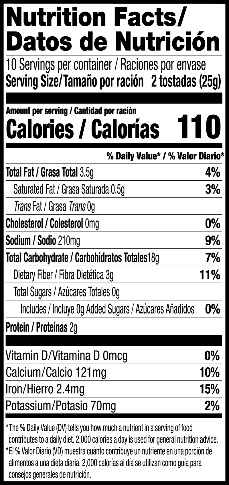 Ingredients: Corn Masa Flour, Water, Vegetable Oil (Canola, Cottonseed, Corn, and/or Sunflower), Iodized Salt, Hydrated Lime.
